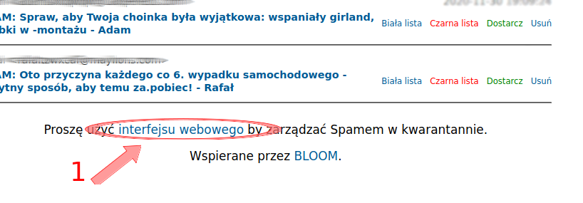 Krok 1. Przechodzimy do interfejsu webowego (1) w celu zarządzania SPAMEM (opcja znajduje się na dole strony)