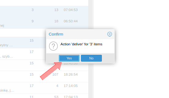 W przypadku zaznaczenia większej ilości wiadomości system zapyta nas o potwierdzenie, jak na obrazie poniżej. Potwierdzamy dostarczenie w tym przypadku 3 wiadomości wybierając Yes / Tak. Analogicznie należy postępować z opcjami Czarna lista (5), Biała lista (6)