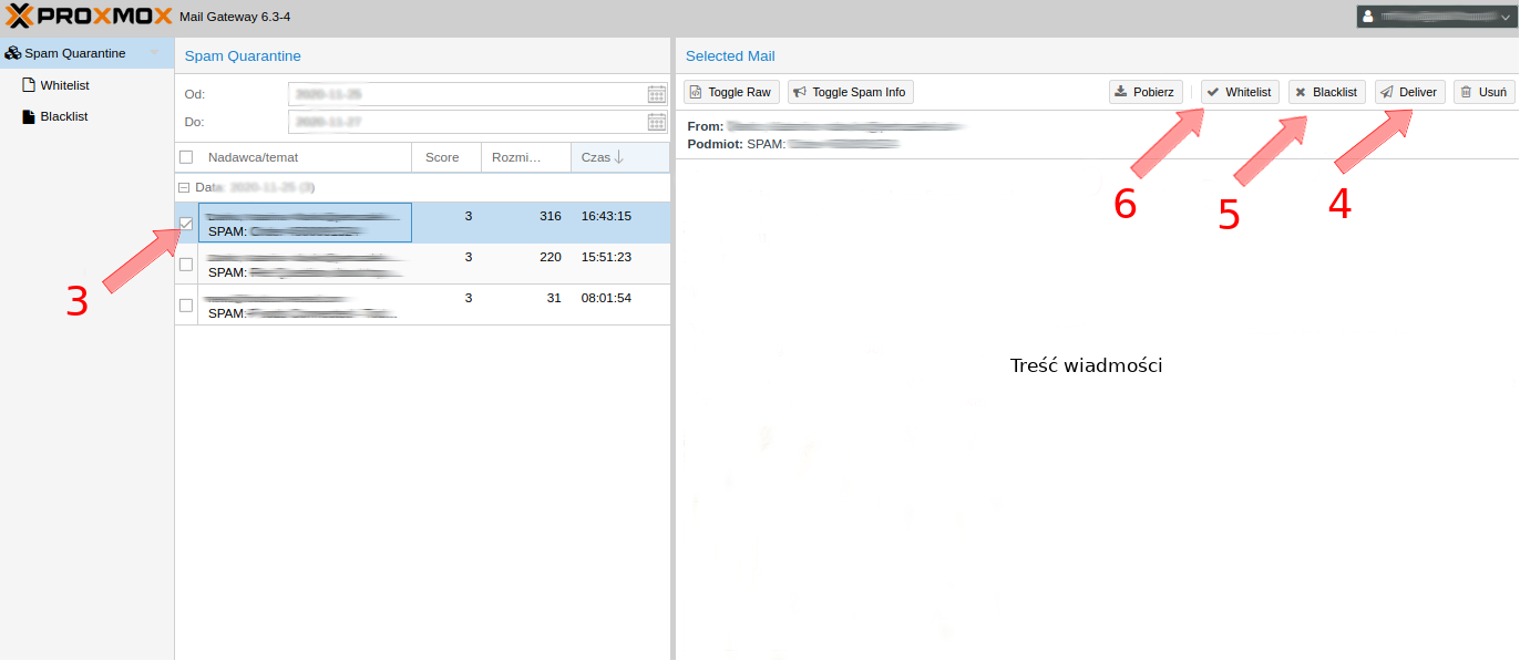 Biała lista (6) jeżeli nadawca wiadomości jest Tobie znany i masz pewność(!), że wiadomość nie jest SPAMEM. Adres nadawcy zostanie dodany do białej listy - w przyszłości wiadomości nie będą traktowane jako SPAM i zostaną dostarczone bezpośrednio na skrzynkę email. Po dokonaniu wyboru (6) należy ponownie zaznaczyć wiadomości i wybrać opcję Dostarcz (4)