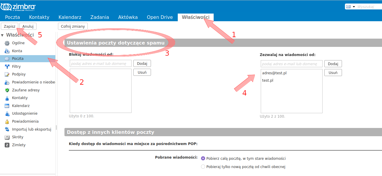 1) Po przejściu do ustawień przedstawionych na powyższym obrazku - w polu oznaczonym nr 4 dodać pożądane przez nas adresy / całe domeny 2) Zapisać ustawienia - przycisk oznaczony nr 5