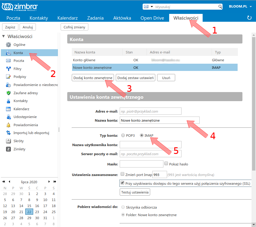 Zakładka Konta umożliwia konfigurację odbioru poczty z zewnętrznych serwerów pocztowych. Należy kolejno wybrać kroki pokazane na obrazku poniżej.