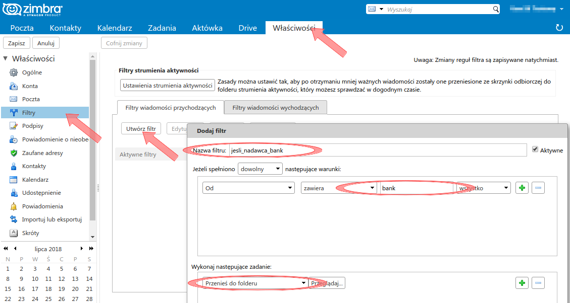 Przy pomocy zakładki Filtry możliwe jest m.in. przeniesienie wiadomości do właściwego folderu, zależnie od zadanych kryteriów (nadawca, temat itp.). Filtrowanie na poziomie serwera jest lepsze niż wykonywanie tej operacji za pomocą programu pocztowego (Outlook, Thunderbird itp.) ponieważ wykonywane jest natychmiast i jest spójne dla wszystkich urządzeń, które mają dostęp do konta.