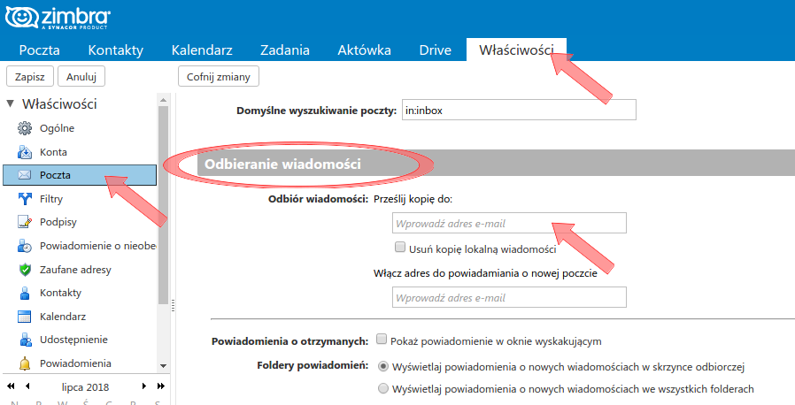 Przekierowania - przekierowanie wszystkich przychodzących wiadomości należy ustawić w zakładce Poczta