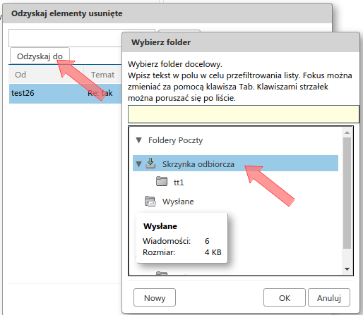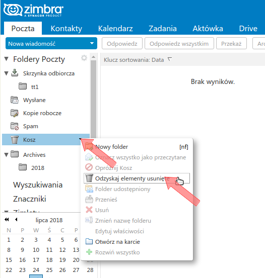 Usunięte wiadomości trafiają do kosza. Wiadomości z kosza opróżniane są ręcznie (przez użytkownika) lub automatycznie po 30 dniach od usunięcia. Od tej chwili, wiadomość jest już niedostępna za pomocą programów pocztowych - jednak za pomocą opisanej tu procedury, możliwe jest odzyskanie wiadomości przez kolejne 30 dni. Należy zalogować się do Poczty przez WWW a następnie: