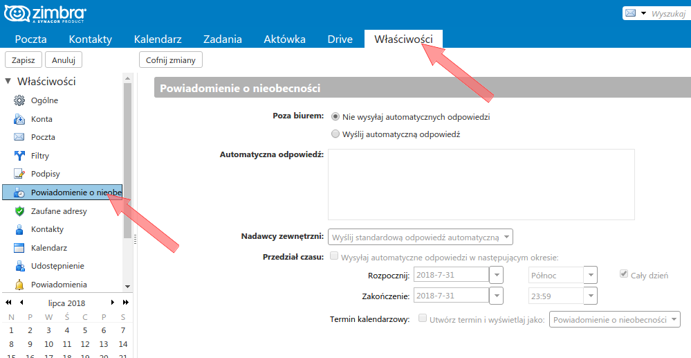 W zakładce Powiadomienie o nieobecności możliwe jest ustalenie treści powiadomienia - różnej dla odbiorców wewnętrznych (ta sama domena) oraz zewnętrznych - oraz daty obowiązywania powiadomienia.